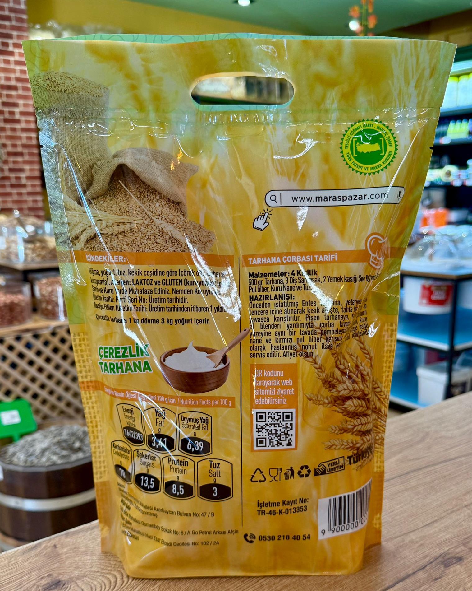 Maraşpazar.com Geleneksel Çerezlik Tarhana Bol Yoğurtlu (450 gr), kendi üretimimiz, katkısız ve Ziraat Mühendisleri tarafından incelenip hazırlanmıştır. Yöresel Maraş usulüyle hazırlanan bu tarhana, yoğurt ağırlıklı formülüyle zengin ve besleyici bir lezzet sunar. Ana içerikleri: yoğurt, döğme (buğday), kekik, tuz ve sudur.